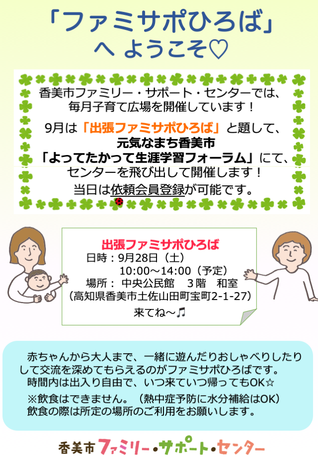 ・9月28日(土) ※出張!ファミサポひろば(at よってたかって生涯学習フォーラム/中央公民館)